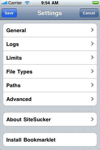 To change specific settings, tap on one of the items in the list. To save your changes and exit the Settings screen, tap on the Save button. To exit the Settings screen without saving your changes, tap on the Cancel button. To see information about the version of SiteSucker you are running, tap on the About SiteSucker item. To find out more about Settings, tap on one of the topics below: |