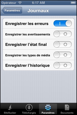 L'écran Journaux présente les paramètres suivants : Enregistrer les erreursActivez cette option pour enregistrer toutes les erreurs qui peuvent survenir durant le déchargement. Cette information est écrite dans le fichier SiteSucker.log. Enregistrer les avertissementsActivez cette option pour enregistrer tous les avertissements qui peuvent survenir durant le déchargement. Cette information est écrite dans le fichier SiteSucker.log. Par exemple, SiteSucker va enregistrer les avertissements de toutes les pages qui utilisent JavaScript ou de tous les fichiers qui ne peuvent être ramenés parce qu'ils sont refusés par robots.txt ou la balise META Robots. Enregistrer l'état finalActivez cette option pour écrire l'état de l'information (niveau, fichiers ramenés, fichiers restants et erreurs) dans le fichier SiteSucker.log lorsqu'un déchargement est terminé. Enregistrer le Type de médiaActivez cette option pour enregistrer le Type de média de chaque fichier. Cette information peut être utile pour configurer les paramètres de Types de fichier. Enregistrer l'historique de déchargementActivez cette option pour enregistrer l'URL de chaque fichier ramené. Cette information est écrite dans le fichier SiteSucker.log. |