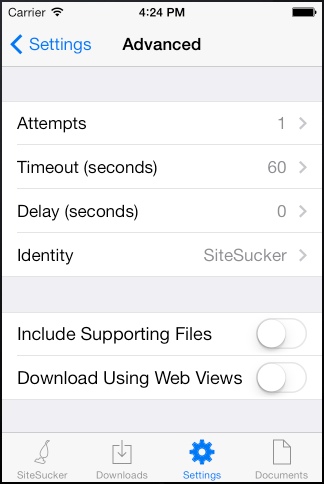The Advanced screen provides the following settings: AttemptsUse this control to specify the number of times SiteSucker should attempt to download a file. SiteSucker will only retry downloading a file if a timeout error occurs. Timeout (seconds)Use this control to select the length of time that SiteSucker should wait for a response from the server. Delay (seconds)Use this control to specify the length of time that SiteSucker should delay between download requests. This feature can allow you to download sites while using very little bandwidth and can help avoid anti-mining safeguards employed by some sites. If you select 0, SiteSucker downloads the site as quickly as possible. If you select any other value, SiteSucker will add a random delay (within the range of the specified delay ± 2 seconds) before it downloads a file. IdentityUse this control to customize the way SiteSucker identifies itself when making a request. Some sites are very particular about which browsers they will allow. You can you use this feature to "fool" the site into thinking that you are using an approved browser. To change SiteSucker's identity, simply tap on this control and select one of the Web browsers listed. (If you choose None, SiteSucker will not include any identifying information when making requests.) Include Supporting FilesSwitch this on to have SiteSucker include supporting files in the download. When this option is on, SiteSucker will download non-HTML files (such as style sheets, images, etc.) even if they are not allowed by the current paths settings or if the Maximum Number of Levels is exceeded. Download Using Web ViewsSwitch this on to have SiteSucker download HTML using hidden web views. When this option is on, SiteSucker will load each HTML file into a hidden web view and then extract the HTML from the web view after the page is loaded. This can be useful if the file uses JavaScript to modify the HTML as the page is loading or if the file is an XML file that can be converted into HTML by the web view. |