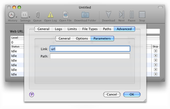 The Parameters tab under the Advanced tab in the Download Settings dialog provides the following settings: LinkSometimes links can be found in a parameter within the query component of URLs. In this text box, enter the key for the link parameter and SiteSucker will scan URLs for this parameter and add its value to the list of URLs to download. For example, if you enter "i" in the Link Parameter text box and SiteSucker downloads http://mysite.com/show.php?w=450&h=314&i=/images/Job31.jpg, the application will also download http://mysite.com/images/Job31.jpg. PathSometimes paths can be found in a parameter within the query component of URLs. In this text box, enter the key for the path parameter and SiteSucker will scan URLs for this parameter and use its value as the path for the downloaded file. For example, if you enter "p" in the Path Parameter text box and SiteSucker downloads http://mysite.com/show.php?w=450&h=314&p=/images/Part32.jpg, the application will save this file using the path mysite.com/images/Part32.jpg relative to the download folder. |