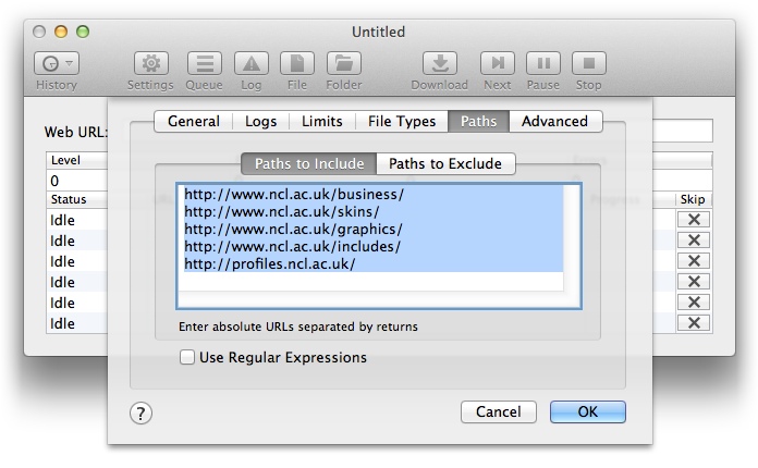 The Paths tab in the Download Settings dialog lets you specify which paths should be included in or excluded from the download. In these text boxes, enter absolute URLs (that is, URLs beginning with "http://" or "https://") or regular expressions separated by returns. The paths settings work in conjunction with the Path Constraint setting under the General tab and the Include Supporting Files setting under the Advanced tab according to the following rules: