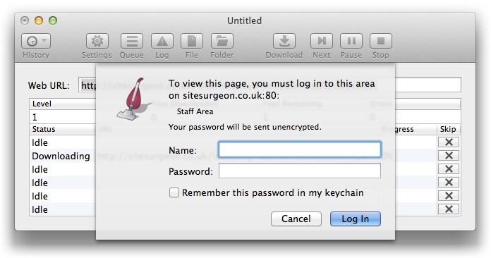If you turn on the Suppress Login Dialog setting under the General tab in the download settings, SiteSucker will not display the login dialog when credentials are requested, and password-protected content will be skipped unless the proper credentials are found in the Keychain. |